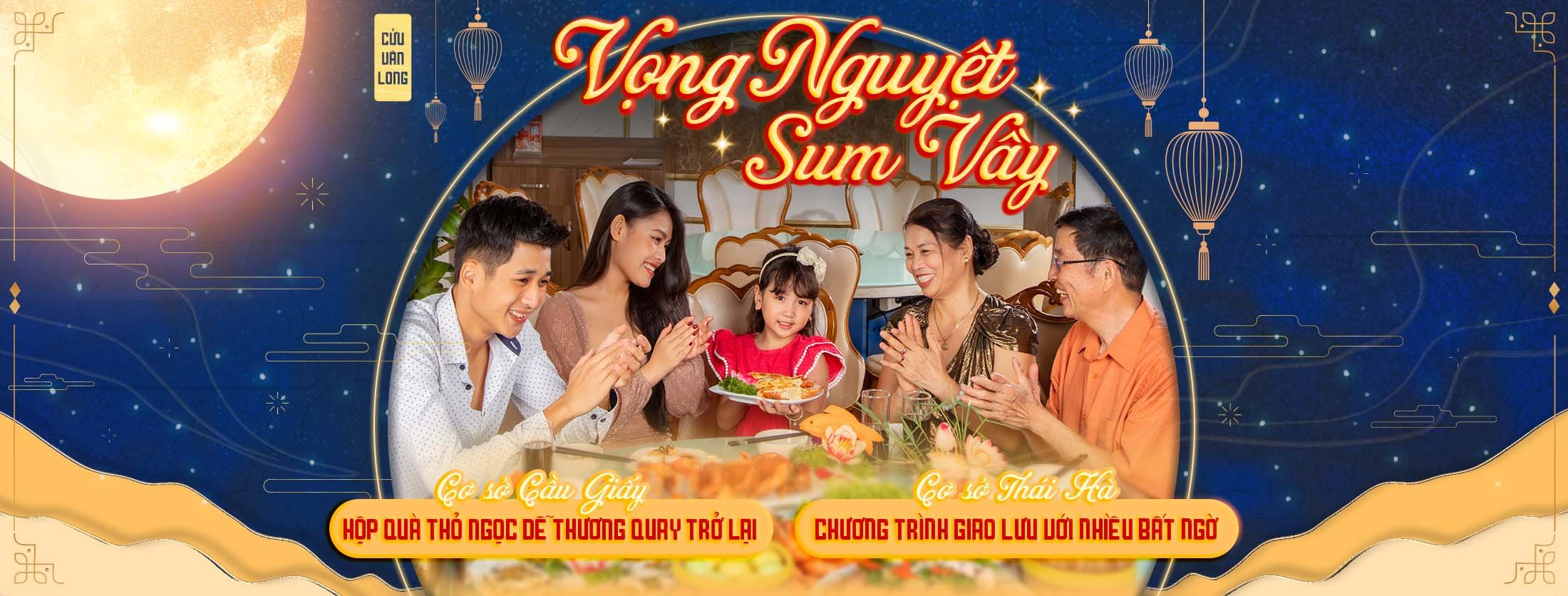 - Đêm giao lưu “Vọng Nguyệt Sum Vầy” với nhiều hoạt động thú vị dành cho gia đình và các bé khi dùng bữa tại Cửu Vân Long vào tối ngày 10/09/2022 (ngày 15 âm lịch): trò chơi thú vị rinh thưởng, chương trình văn nghệ đặc sắc, màn biểu diễn hề nặn bóng…